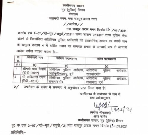 दुर्ग राजनांदगांव 17 मई 2021। दुर्ग आईयूसीएडब्ल्यू में पदस्थ अतिरिक्त पुलिस अधीक्षक प्रज्ञा मेश्राम को रानांदगांव का एडिशनल एसपी बनाया गया है। वहीं कविलाश टंडन को एडिशनल एसपी राजनांदगांव से अतिरिक्त पुलिस अधीक्षक यातायात दुर्ग के पद पर तैनात किया गया है। देखें आदेश….