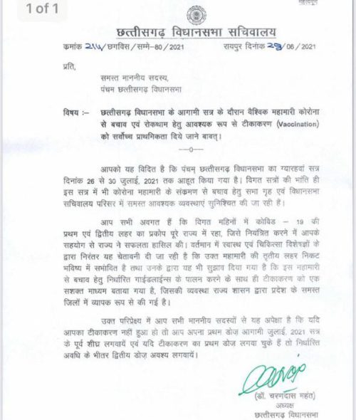 विधानसभा अध्यक्ष महंत ने सभी विधायकों को लिखा पत्र- “सत्र शुरु होने वाला है.. यदि टीका ना लगा हो तो लगवा लें.. पहला लग चुका हो तो दूसरा लगवा लें”