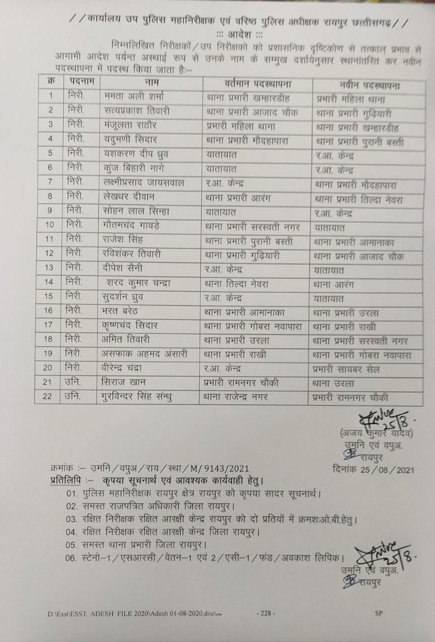 रायपुर 25 अगस्त 2021। राजधानी में बड़े अपराध के बीच कई थाना प्रभारियों की छुटटी हो गयी है। देर शाम रायपुर एसएसपी अजय यादव ने 20 निरीक्षक और 2 एसआई की ट्रांसफर सूची जारी की है। सूची में एक बात गौर करने वाली ये भी है कि अधिकांश उन थाना प्रभारियों की छुटटी हुई हैं, जिनक इलाकों में या तो चाकूबाजी की घटनाएं ज्यादा हुई है या फिर ज्यादा अपराध हुये है। देर शाम जारी सूची में मौदहापारा, पुरानी बस्ती, गुढ़यारी,उरला जैसे इलाके शामिल है। जहां पर चाकूबाजी, रेप, चोरी या फिर छोटी बड़ी वारदाते हुई थी। लिस्ट में ये भी बात देखने को आई है कि लंबे समय से एक ही थाने में जमे थाना प्रभारियों को भी बदल दिया गया है। देखें पूरी सूची…
