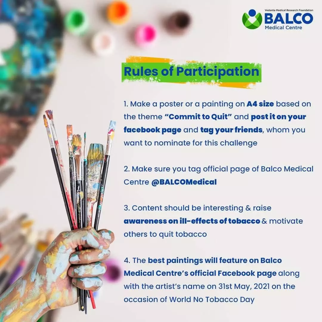 विश्व तंबाकू निषेध दिवस पर बालको मेडिकल सेंटर कर रहा है फेसबुक पर पोस्टर मेकिंग व पेंटिंग चैलेंज का आयोजन