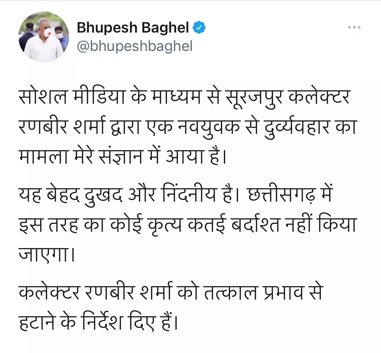 रायपुर 23 मई 2021। बीच सड़क पर चाटा मारने वाले और लाठियों से पिटवाने वाले कलेक्टर की छुट्टी हो गयी है। सूरजपुर कलेक्टर रणवीर शर्मा को तत्काल प्रभाव से हटा दिया गया है।