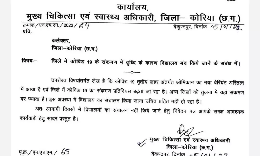 कोरिया CMHO ने लिखा कलेक्टर को पत्र .. कोविड संक्रमण को देख स्कुल बंद करने की सिफ़ारिश..लिखा - संक्रमण दर ज़्यादा है..स्कुल संचालन उचित नही