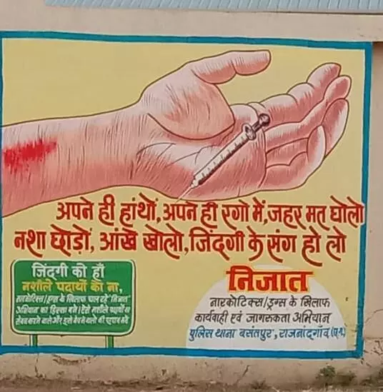 राजनांदगांव 27 मार्च 20212। राजनांदगांव पुलिस अधीक्षक राजनांदगांव संतोष सिंह के निर्देशन में अभियान निजात के तहत 27 मार्च को थाना बसंतपुर पुलिस द्वारा नारकोटिक्स/ड्रग्स के खिलाफ थाना क्षेत्रों के महामाया चौक, दुर्गा चौक, भदोरिया चौक, आरके नगर चौक, गौरव पथ, कमला कॉलेज रोड आदि चौक चौराहो एवं सार्वजनिक स्थानों व बाजार आदि जगहों पर दीवारों में पेटिंग एवं बैनर, पोस्टर चस्पा कर गांजा/ड्रग्स/सिलोशन एवं सिरिंज से होने वाले दुष्परिणामों से जागृत किया गया है। नारकोटिक्स/ड्रग्स के दुष्प्रभाव सिर्फ उस व्यक्ति को तबाह नहीं करते, जो इसके आदी होते हैं, बल्कि ये परिवार, समाज और राष्ट्र को भी जर्जर करते हैं। थाना बसंतपुर पुलिस द्वारा ''निजात'' अभियान कार्यक्रम के माध्यम से अपने थाना क्षेत्र में जागरूकता अभियान बड़ी व्यापक रूप से प्रचार-प्रसार जोर-शोर से नशा से होने वाले दुष्परिणामों को बारे में बताया जा रहा है।