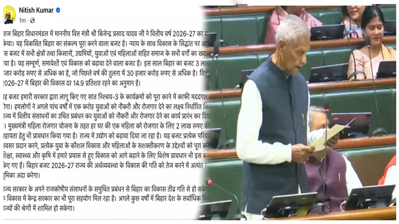 पटना, 03 फरवरी 2026 : बिहार विधानमंडल में वित्त मंत्री बिजेन्द्र प्रसाद यादव द्वारा पेश किये गये वित्तीय वर्ष 2026-27 के बजट पर अपनी प्रतिक्रिया व्यक्त करते हुये मुख्यमंत्री नीतीश कुमार ने कहा कि यह विकसित बिहार का संकल्प पूरा करनेवाला बजट है। न्याय के साथ विकास के सिद्धांत पर आधारित इस बजट में सभी क्षेत्रों तथा किसानों, उद्यमियों, युवाओं एवं महिलाओं सहित समाज के सभी वर्गों का ख्याल रखा गया है। यह सम्पूर्ण, समावेशी एवं विकास को बढ़ावा देनेवाला बजट है। इस साल बिहार का बजट 3 लाख 47 हजार करोड़ रूपये से अधिक का है, जो पिछले वर्ष की तुलना में 30 हजार करोड़ रूपये से अधिक है। वित्तीय वर्ष 2026-27 में बिहार की विकास दर 14.9 प्रतिशत रहने का अनुमान है।