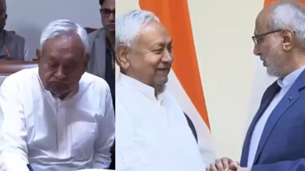 Nitish Kumar Rajya Sabha Oath News: बिहार के मुख्यमंत्री नीतीश कुमार अब राज्यसभा के सदस्य बन गए हैं। आज संसद भवन में उपराष्ट्रपति और राज्यसभा के सभापति सीपी राधाकृष्णन ने दोपहर 12:15 बजे नीतीश कुमार को राज्यसभा की शपथ दिलाई। इस दौरान एनडीए के कई प्रमुख नेताओं के साथ बिहार के दोनों उप मुख्यमंत्री सम्राट चौधरी और विजय कुमार सिन्हा भी मौजूद रहे। शपथ ग्रहण समारोह के बाद नीतीश कुमार सीधे दिल्ली में कामराज लेन स्थित अपने आधिकारिक आवास रवाना हो गए। इससे पहले जदयू के कार्यकारी अध्यक्ष संजय झा ने नीतीश कुमार को सिग्नेचर करने के लिए पेन दिया। इसके बाद मुख्यमंत्री ने कहा कि हो गया। चलें। इस पर फोटो सेशन के लिए रुकने के लिए कहा गया।