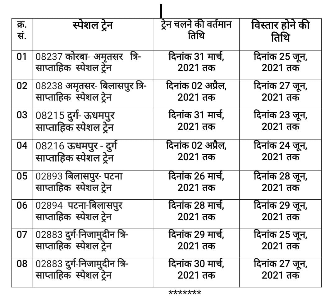 दक्षिण पूर्व मध्य रेल्वे से चलने वाली अमृतसर, ऊधमपुर, पटना एवं निजामुदीन की ओर जाने वाली कुल 04 स्पेशल ट्रेनों के परिचालन में विस्तार