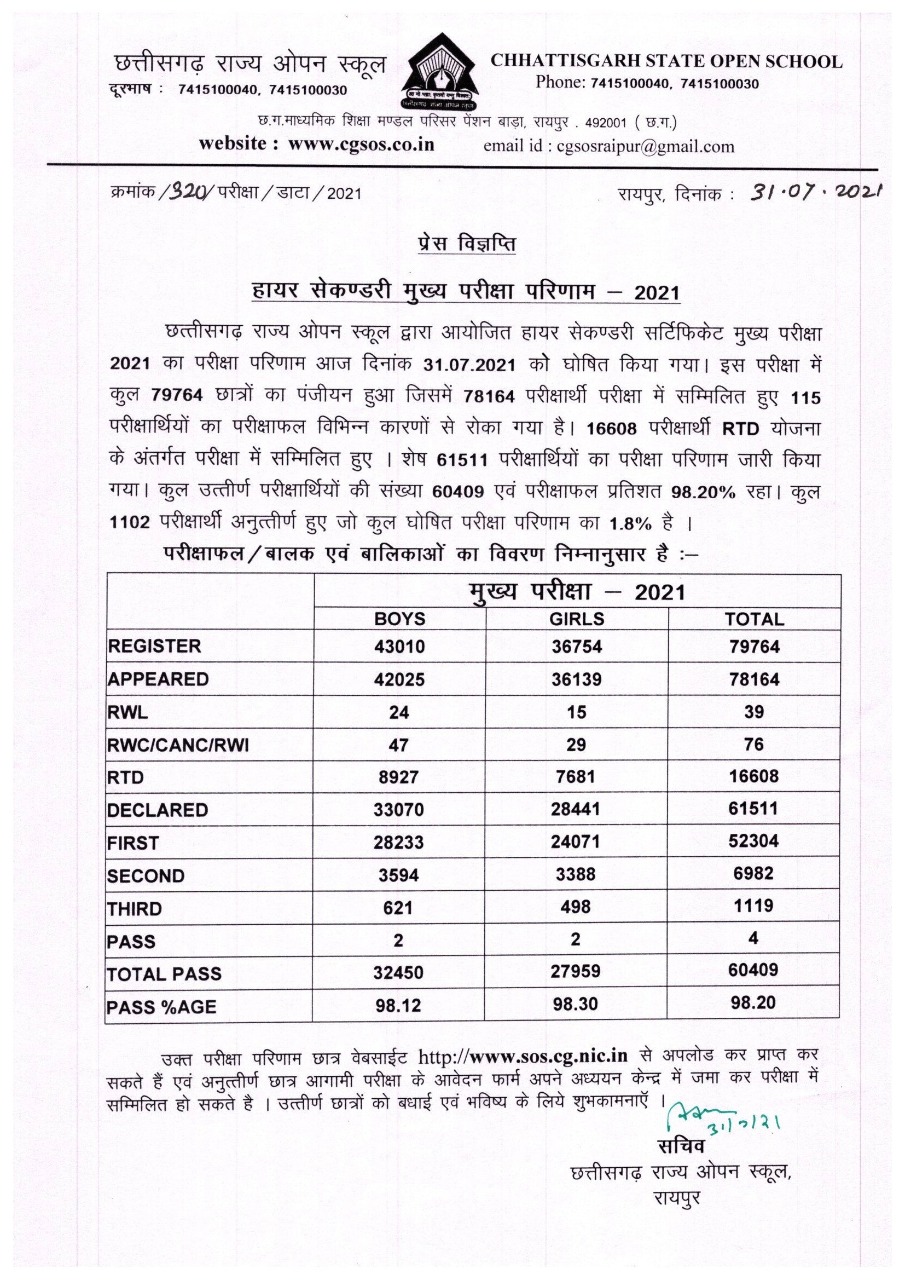 रायपुर 31 जुलाई 2021। छत्तीसगढ राज्य ओपन परीक्षा के परिणाम जारी हो गये हैं। आज स्कूल शिक्षा मंत्री प्रेमसाय सिंह टेकाम ने वीडियो कांफ्रेंसिंग के जरिये परीक्षा परिणाम को जारी किया। प्रदेश में इस बार 12वीं ओपन परीक्षा में ल़ड़कों ने बाजी मारी है। इस बार 12वीं ओपन परीक्षा का परिणाम 98.20 प्रतिशत रहा है। 52 हजार 304 बच्चे फर्स्ट डिवीजन से पास हुए हैं। इस बार की परीक्षा में लड़कों ने मारी बाजी ।कुल 61511 परीक्षार्थियों के जारी किए गए नतीजों में 60409 परीक्षार्थी उत्तीर्ण रहे हैं। कुल 1102 परीक्षार्थियों अनुत्तीर्ण हुए हैं।