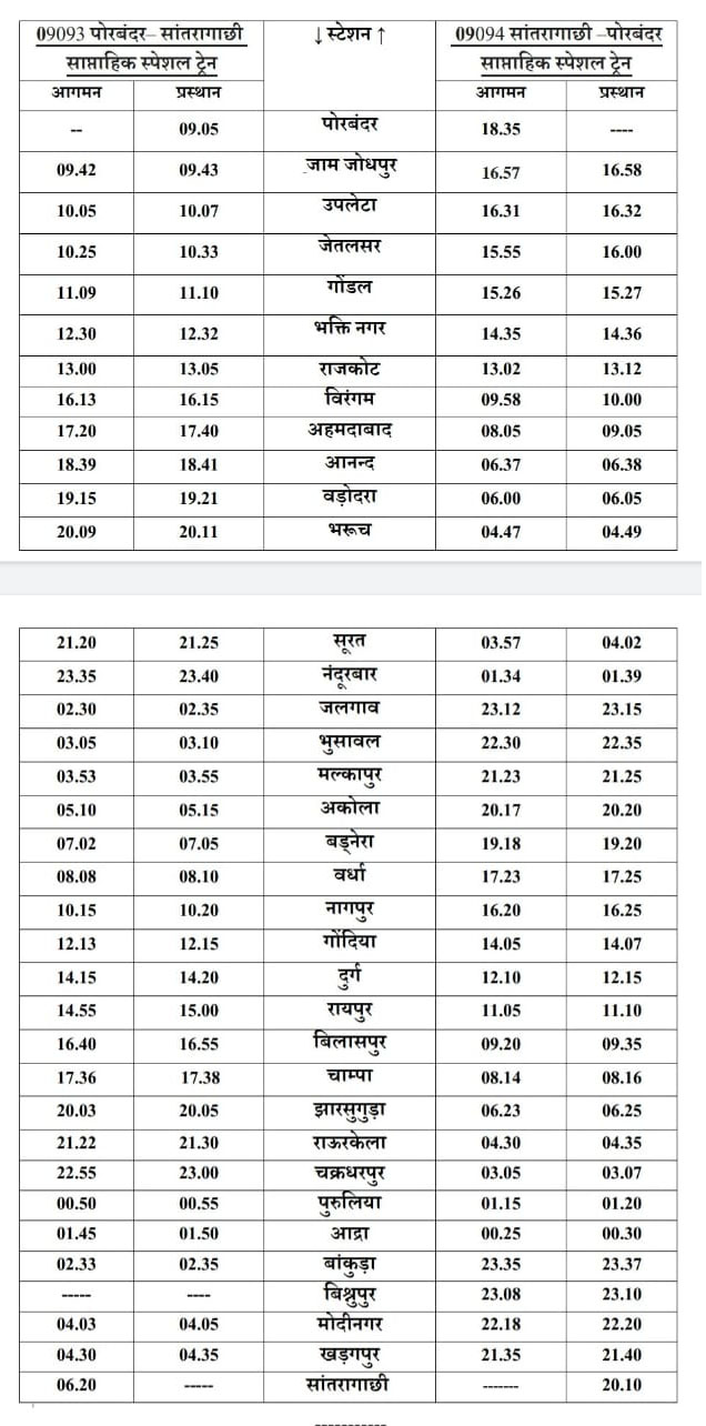 रेल यात्रियों की सुविधा एवं मांग को ध्यान में रखते हुए दक्षिण पूर्व मध्य रेलवे से होकर जाने वाली 09093/ 09094 पोरबंदर–सांतरागाछी–पोरबंदर साप्ताहिक स्पेशल ट्रेन की सुविधा प्रदान की जा रही है यह सुविधा (प्रत्येक शुक्रवार) को पोरबंदर से दिनांक 16 अप्रैल, 2021 एवं (प्रत्येक रविवार) को सांतरागाछी से 18 अप्रैल, 2021 से शुरू की जा रही है । यह गाड़ी आगामी आदेश तक चलती रहेगी ।
