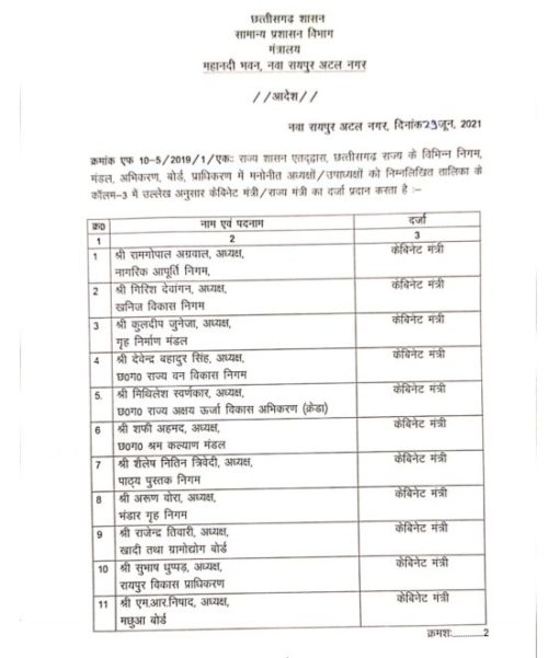 रायपुर 29 जून 2021 राज्य सरकार ने प्रदेश के विभिन्न निगमों, मंडलों, अभिकरण, बोर्ड और प्राधिकरण के अध्यक्षों और उपाध्यक्षों को कैबिनेट मंत्री और राज्य मंत्री का दर्जा प्रदान किया है.