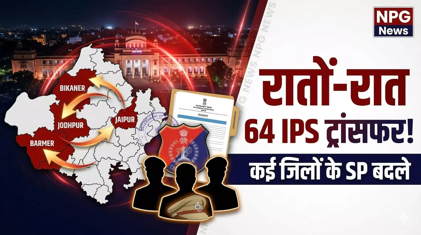 Rajasthan IPS Transfer: राजस्थान सरकार का बड़ा एक्शन। पुलिस महकमे में देर रात 64 IPS अधिकारियों के तबादले। जयपुर, जोधपुर, बीकानेर और बाड़मेर समेत कई जिलों के SP बदले गए।