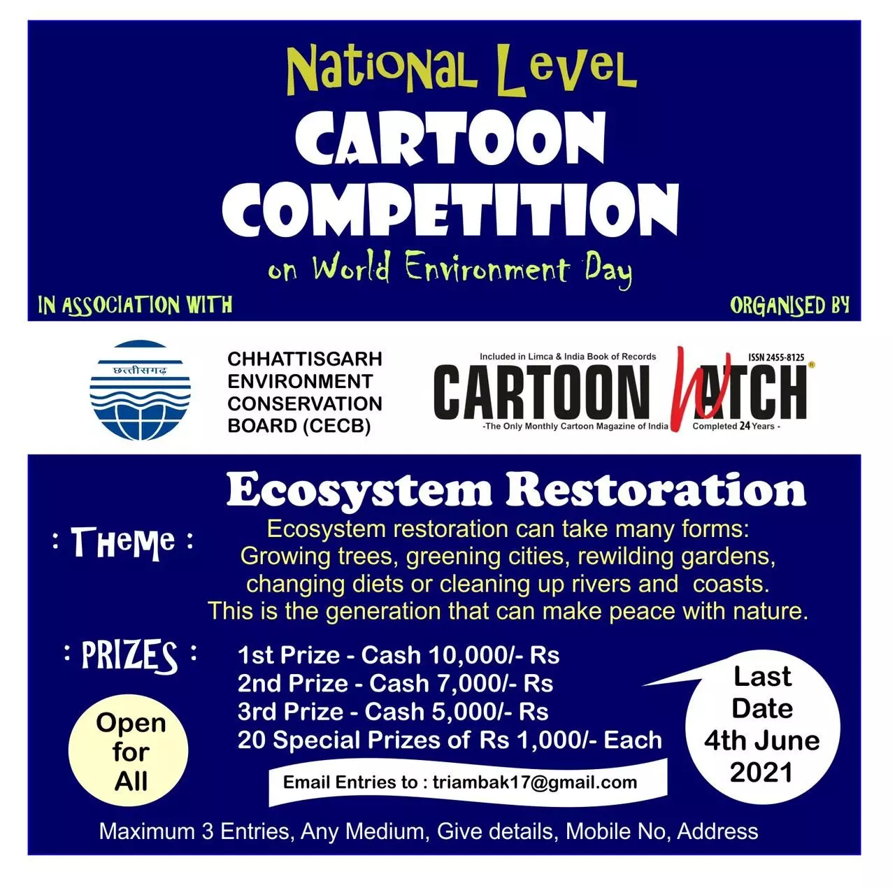 रायपुर 28 मई 2021. देश की एकमात्र कार्टून पत्रिका कार्टून वाॅच द्वारा हर वर्ष की तरह इस वर्ष भी विश्व पर्यावरण दिवस पर छत्तीसगढ़ पर्यावरण संरक्षण मंडल के सहयोग से कार्टून प्रतियोगिता आयोजित कर रही है. यह प्रतियोगिता अखिल भारतीय स्तर पर आयोजित की जाती है. इस प्रतियोगिता में उम्र का कोई बंधन नहीं होता और कोई भी व्यक्ति अपनी प्रविष्टि ई मेल के माध्यम से भेज सकता है.