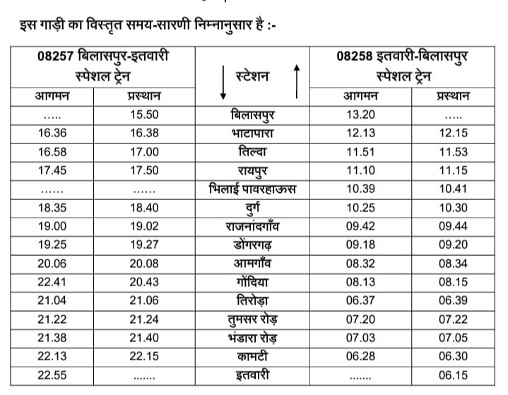 गाड़ी संख्या 08257 बिलासपुर-इतवारी एक्सप्रेस स्पेशल गाड़ी प्रतिदिन बिलासपुर से 15.50 बजे रवाना होगी तथा 22.55 बजे इतवारी पहुंचेगी | इसी प्रकार गाड़ी संख्या 08258 इतवारी-बिलासपुर एक्सप्रेस स्पेशल प्रतिदिन इतवारी से 06.15 बजे रवाना होगी तथा 13.20 बजे बिलासपुर पहुंचेगी |