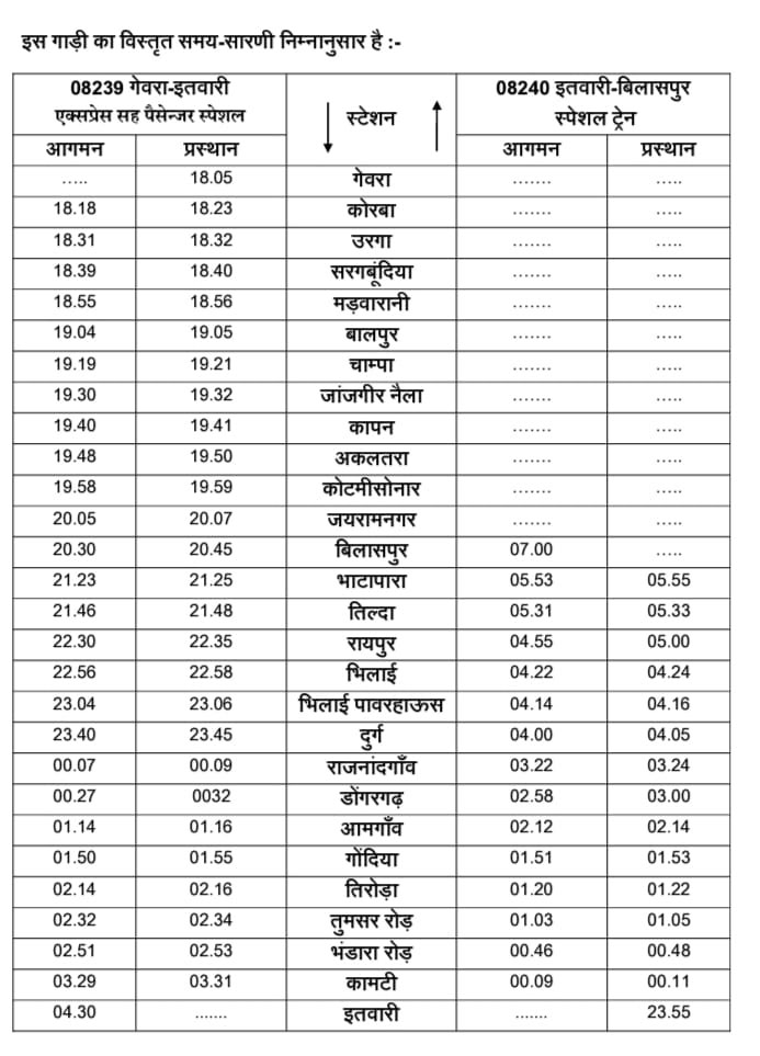 गाड़ी संख्या 08239 गेवरा-इतवारी एक्सप्रेस सह पैसेन्जर स्पेशल गाड़ी प्रतिदिन गेवरा से 18.05 बजे रवाना होगी तथा दूसरे दिन 04.30 बजे इतवारी पहुंचेगी | इसी प्रकार गाड़ी संख्या 08240 इतवारी-बिलासपुर एक्सप्रेस स्पेशल प्रतिदिन इतवारी से 23.55 बजे रवाना होगी तथा दूसरे दिन 07.00 बजे बिलासपुर पहुंचेगी |