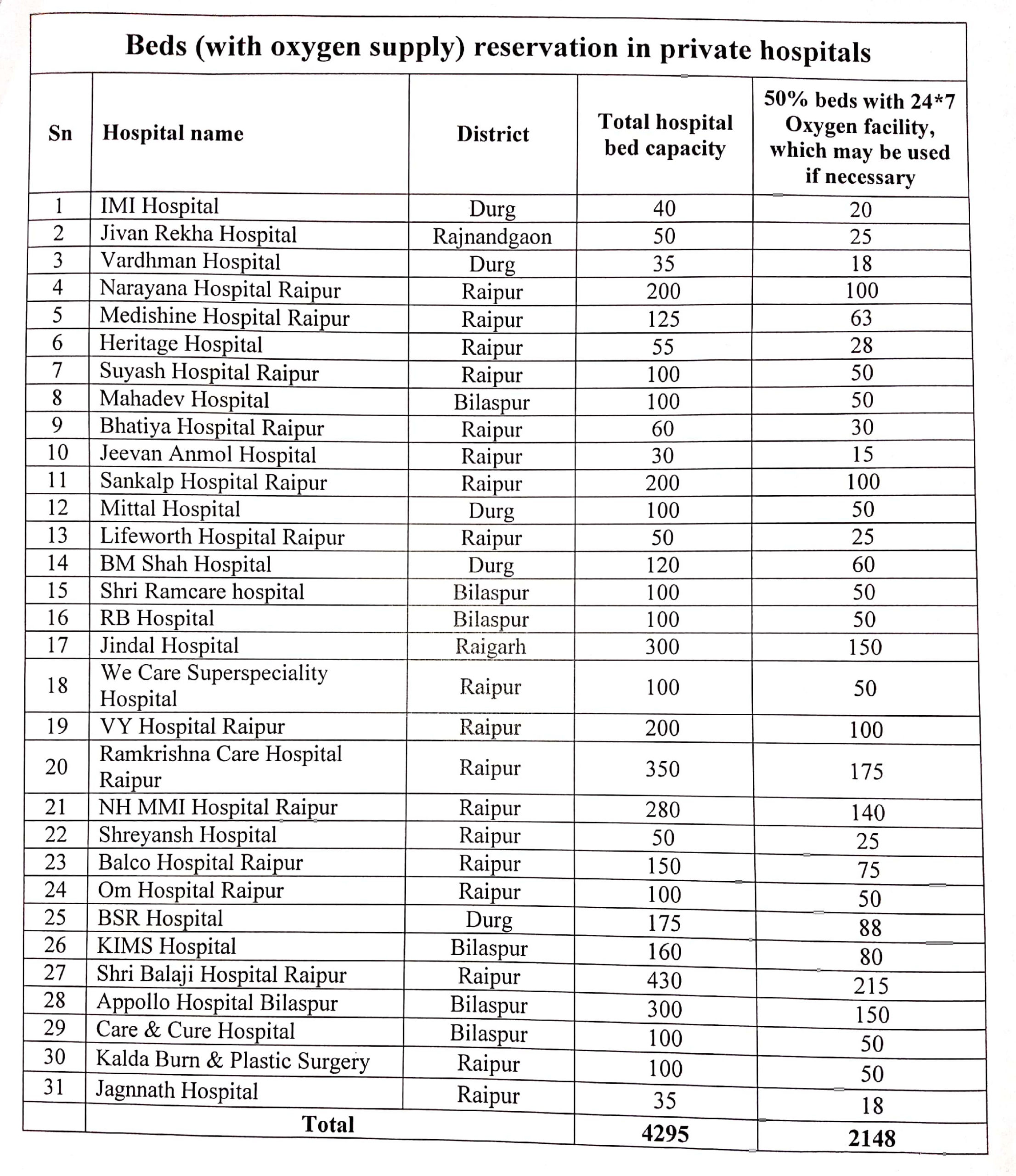 स्वास्थ्य विभाग की तरफ से जारी आदेश में इन 31 अस्पतालों में कुल बेड 4295 हैं, जिनमे 2148 बेड कोरोना मरीजों के लिए रिजर्व रखे जायेंगे। इन अस्पतालों में आक्सीजन की उपलब्धता के साथ मरीजों के लिए बेड आरक्षित रहेंगे।