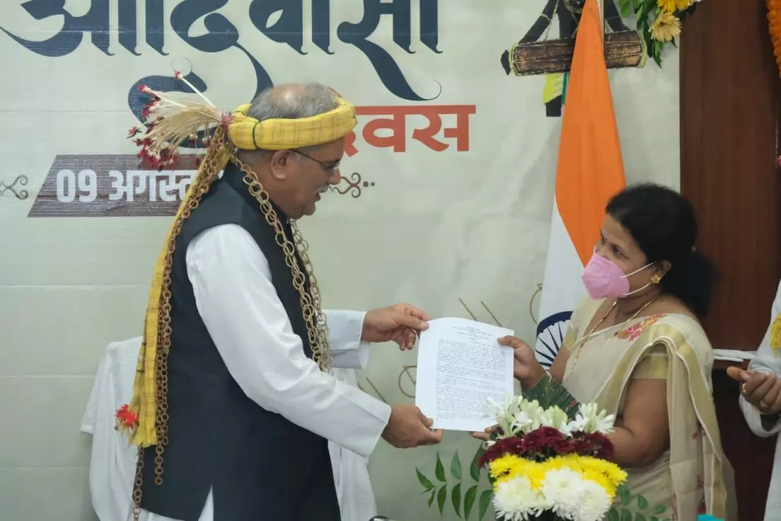 रायपुर 9 अगस्त 2021 । मुख्यमंत्री भूपेश बघेल ने आज विश्व आदिवासी दिवस के मौके पर भारतीय प्रशासनिक सेवा के दिवंगत अधिकारी चंद्रकांत उईके की धर्मपत्नी रमा उईके को अनुसूचित जाति एवं अनुसूचित जनजाति विकास विभाग में सहायक अनुसंधान अधिकारी के पद पर अनुकम्पा नियुक्ति पत्र सौंपा।