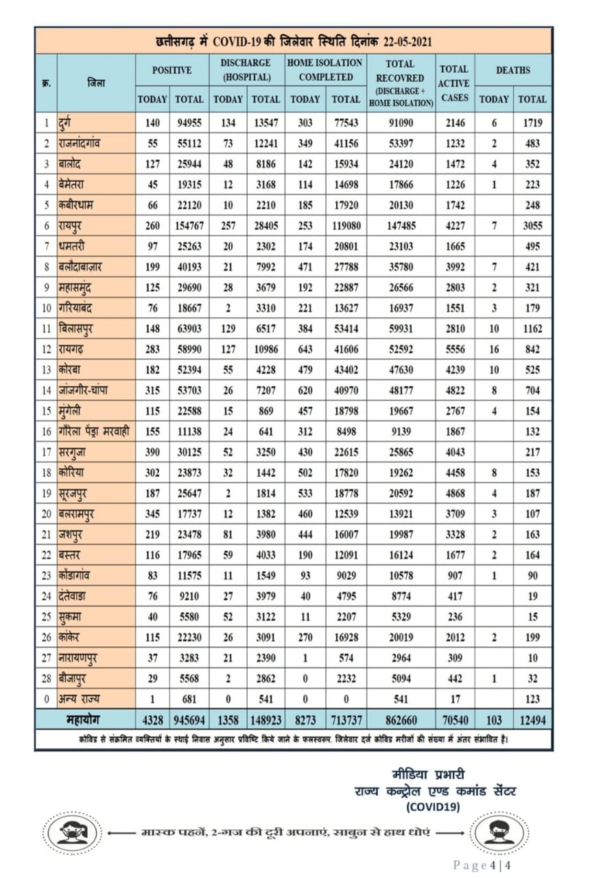 रायपुर 22 मई 2021। छत्तीसगढ़ में कोरोना की रफ्तार हर दिन कम हो रही है। प्रदेश में आज 4328 नये मरीज मिले हैं, जबकि 9631 मरीज कोरोना से स्वस्थ्य हुए हैं। प्रदेश में अब कुल एक्टिव मरीजों की संख्या घटकर 70 हजार 540 रह गयी है। आज प्रदेश में 103 मरीजों की कोरोना से मौत हुई है।