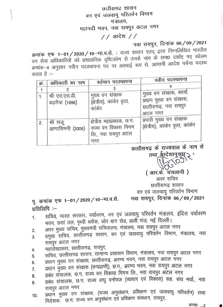 रायपुर 6 सितंबर 2021। IFS एसएसडी बड़गैय्या प्रधान मुख्य वन संरक्षक कार्यालय के CCF होंगे। कांकेर रीजन के चीफ कंजरवेटर ऑफ फारेस्ट रहे 1996 बैच के IFS एसएसडी बडगैय्या को प्रधान पीसीसीएफ कार्यालय में CCF बनाया गयाहै। वहीं 2006 बैच के IFS राजू आगासिमनी कांकेर वृत्त के प्रभारी सीसीएफ होंगे। इससे पहले राजू राज्य वन विकास निगम में क्षेत्रीय महाप्रबंधक थे।
