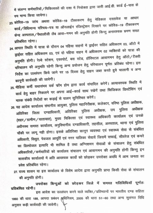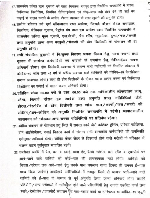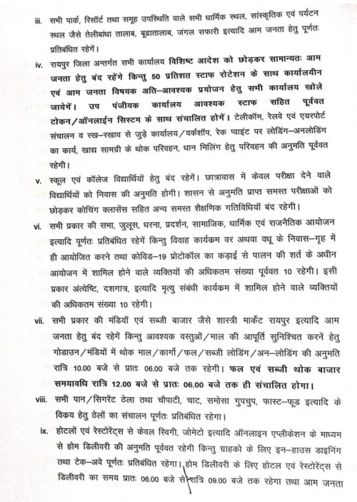 रायपुर के लिए जारी लॉकडाउन आदेश में सुपर मार्केट, बाजार, सब्जी बाजार, मॉल, शो रूम, स्वीमिंग पुल, क्लब, सिनेमा हॉल, सैलून, ब्यूटी पार्लर बंद रहेगा। वहीं शराब दुकानें और बार भी अभी नहीं खुलेंगे। फल व सब्जी के थोक बाजार रात 12 बजे से सुबह 6 बजे तक खुलेंगे। पान, ठेला, चौपाटी, चाट, समोसा गुपचुप व फास्ट फूड की दुकानें भी बंद रहेगी। होटल व रेस्टोरेंट से होम डिलेवरी होगी। ये वक्त सुबह 6 से रात 9 बजे तक होगा।