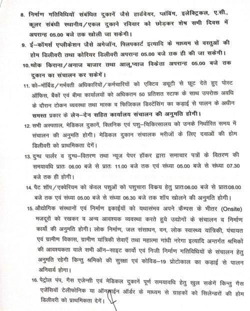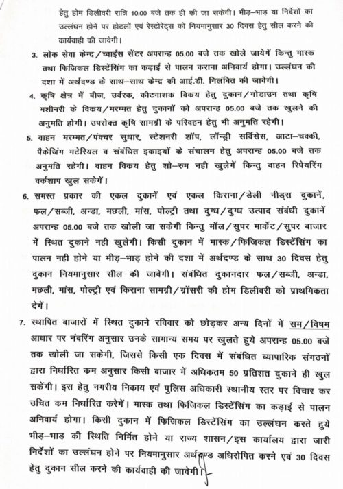 आदेश के मुताबिक किराना, डेली निड्स, फल, सब्जी, अंडा, मछली, मांस अंडा, दूध शाम 5 बजे तक खोली जा सकेगी। बाजारों की दुकानें रविवार को छोड़ को एड और इवन नंबर सम व विषम नंबर के आधार पर शाम 5 बजे तक खुलेगी।