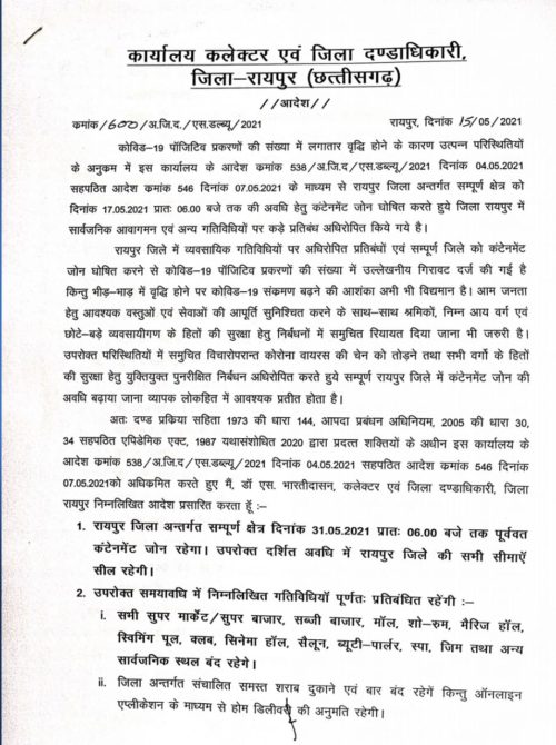 CG लॉकडाउन बिग ब्रेकिंग : राजधानी सहित इन जिलों में लॉकडाउन 15 दिनों के लिए और बढ़ाया गया…. जानिये क्या खुलेगी और क्या रहेगी बंद….इन दुकानों पर अभी पूर्ण प्रतिबंध