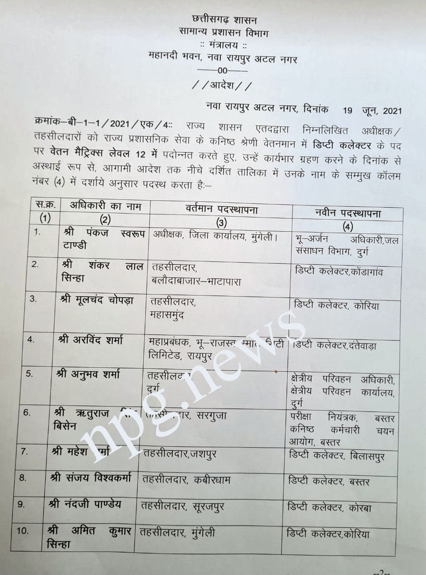 रायपुर 19 जून 2021। छत्तीसगढ़ में तहसीलदारों को राज्य सरकार ने तोहफा दिया है। राज्य सरकार ने 56 तहसीलदारों को डिप्टी कलेक्टर के पद पर प्रमोशन देते हुए अलग-अलग जगहों पर पदस्थ किया है। राज्य सरकार ने कई तहसीलदारों को प्रमोशन देकर अलग-अलग जिलों में भेजा गया है। 6 तहसीलदार को डिप्टी कलेक्टर पद पर पदोन्नत करते हुए जनपद सीईओ बनाया गया है। सरगुजा तहसीलदार ऋतुराज सिंह बिसेन को बस्तर कर्मचारी चयन आयोग का परीक्षा नियंत्रक बनाया गया है। वहीं दुर्ग तहसीलदार अनुभव शर्मा को क्षेत्रीय परिवहन अधिकारी दुर्ग बनाया गया है। रायपुर में पदस्थ नेहा भेड़िया को आरडीए का एडिश्नल सीईओ बनाया गया है।