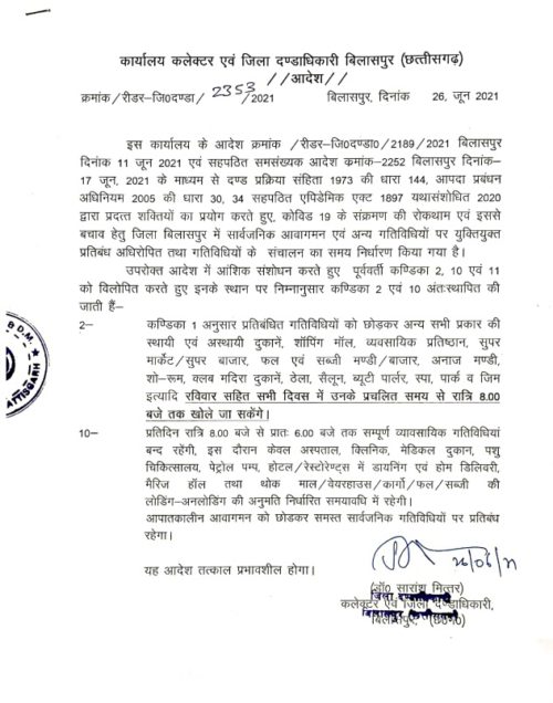 बिलासपुर 26 जून 2021। राजधानी रायपुर के बाद अब बिलासपुर में भी सभी दुकाने व संस्थानों को बंद करने के समय को बढ़ा दिया गया है। साथ ही रविवार में होने वाले लाॅकडाउन को भी हटा दिया गया है। अब रविवार को भी दुकाने रात 8 बजे तक के खुली रहेगी। ये आदेश आज बिलासपुर कलेक्टर सारांश मित्तर ने जारी किया है।