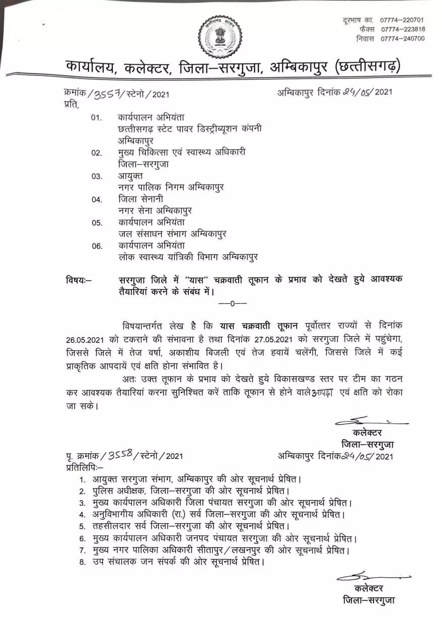 सरगुजा जिला प्रशासन ने चक्रवात यास को लेकर अलर्ट जारी किया है। जिला प्रशासन ने अधिकारियों को चेतावनी जारी करते हुए चक्रवात के मद्देनजर व्यापक तैयारी के आदेश दिया है। दरअसल यास चक्रवात पूर्वोत्तर के राज्यों में 26 को टकरायेगा, जिसके बाद छत्तीसगढ़ के कई हिस्सों में बारिश होगी। ओले और बिजली गिरने की संभावना है।