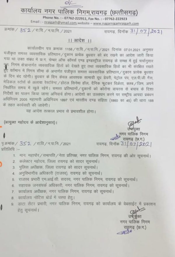 रायगढ़ 2 अगस्त 2021। कोरोना को बढ़ने से रोकने के लिए जिले में अब प्रत्येक बुधवार को व्यवसायिक प्रतिष्ठान और दुकानें बंद रहेगी। कलेक्टर ने आज इस बाबत आदेश जारी किया है। आदेश के अनुसार बुधवार को केवल दूध डेयरी, पेट्रोल पंप, एलपीजी गैस, मेडिकल स्टोर्स के अलावा रेस्टोरेंट, होटल सिनेमा हाॅल दैनिक फुटकर क्लब, जिम अपने निर्धारित समय में खुले रहेंगे। देखें आदेश..