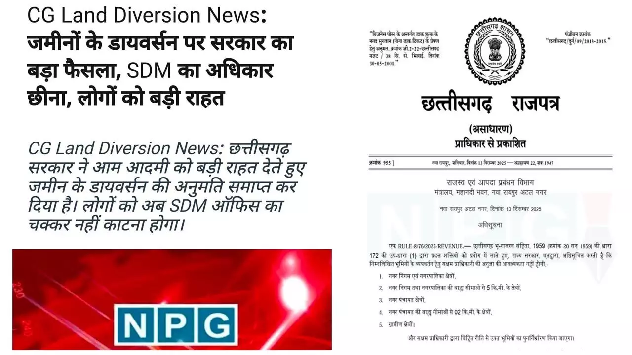दिसंबर 2025 में राजस्व विभाग ने आदेश में लिखा, जमीनों के डायवर्सन का सक्षम अधिकारी की अब अनुमति की जरूरत नही होगी। 13 दिसंबर को इस नोटिफिकेशन को राजपत्र में प्रकाशित कर दिया गया। राजस्व के मामले में इसे बड़ा सुधार माना गया। क्योंकि, लोग अपनी जमीनों का डायवर्सन खुद कर सकते थे।