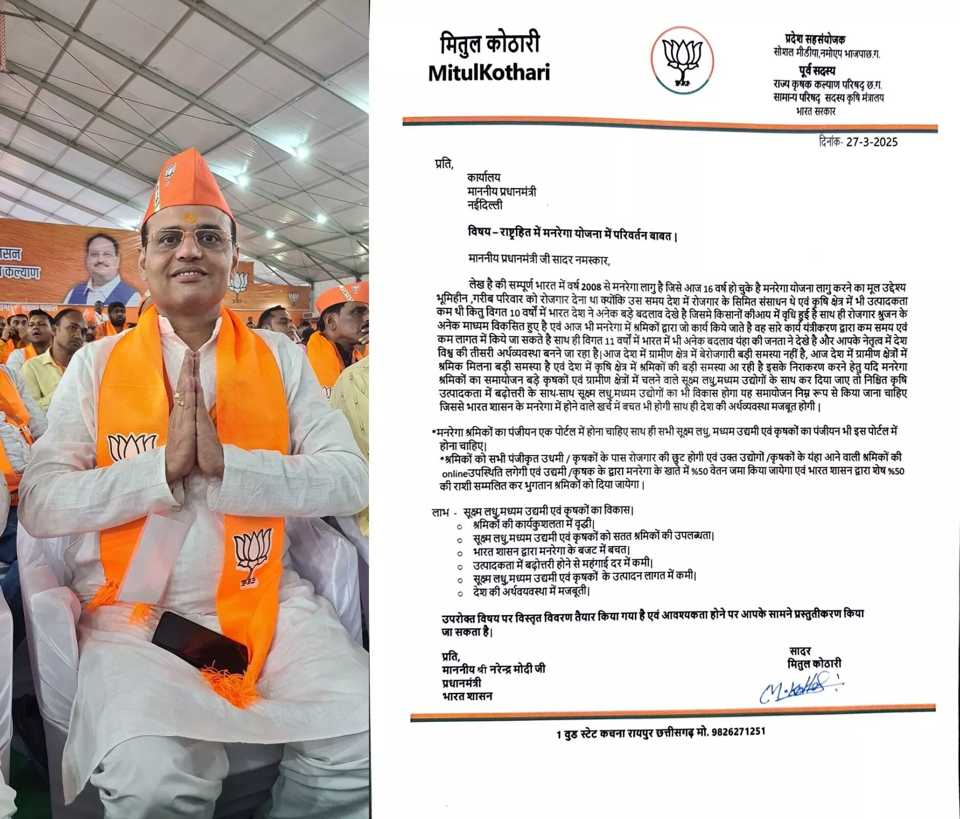 नई दिल्ली/रायपुर। देश में मनरेगा योजना के नाम और काम करने के तरीके को बदलने पर चर्चा चल रही है। इसी बीच छत्तीसगढ़ बीजेपी के सोशल मीडिया प्रदेश संयोजक मितुल कोठारी का नाम सामने आया है। मार्च 2025 में उन्होंने प्रधानमंत्री कार्यालय यानी PMO को एक चिट्ठी लिखी थी। इस चिट्ठी में उन्होंने कहा था कि मनरेगा को सिर्फ मज़दूरी तक सीमित नहीं रखा जाए, बल्कि गांव के लोगों की स्थायी रोज़ी-रोटी (आजीविका) से जोड़ा जाए, ताकि लोगों को लंबे समय तक फायदा मिल सके।