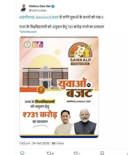 सीएम विष्णुदेव ने एक्स पोस्ट कर कहा...#छत्तीसगढ़_SANKALP_बजट से लगेंगे युवाओं के सपनों को पंख !! राज्य के विश्वविद्यालयों को अनुदान हेतु 731 करोड़ रुपये का प्रावधान