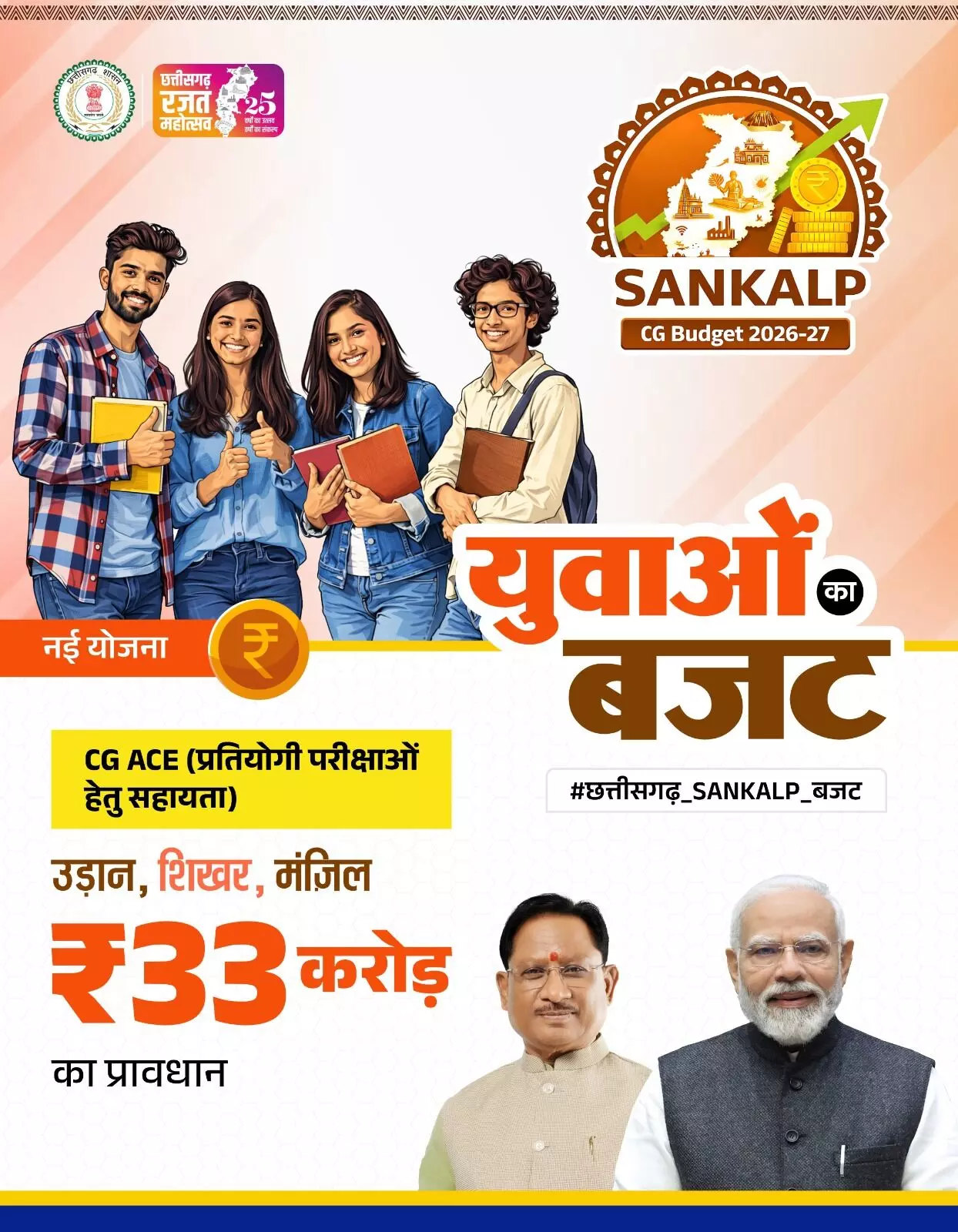 CG, ACE (प्रतियोगी परीक्षाओं हेतु सहायता) उड़ान, शिखर, मंजिल 33 करोड़ का प्रावधान।