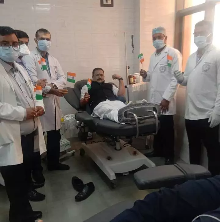 गणतंत्र दिवस पर एम्स के रक्तदान शिविर में कांग्रेस नेता नितिन भंसाली ने अपने जीवन का 66वां रक्तदान कर शहीदों को श्रद्धांजलि अर्पित की