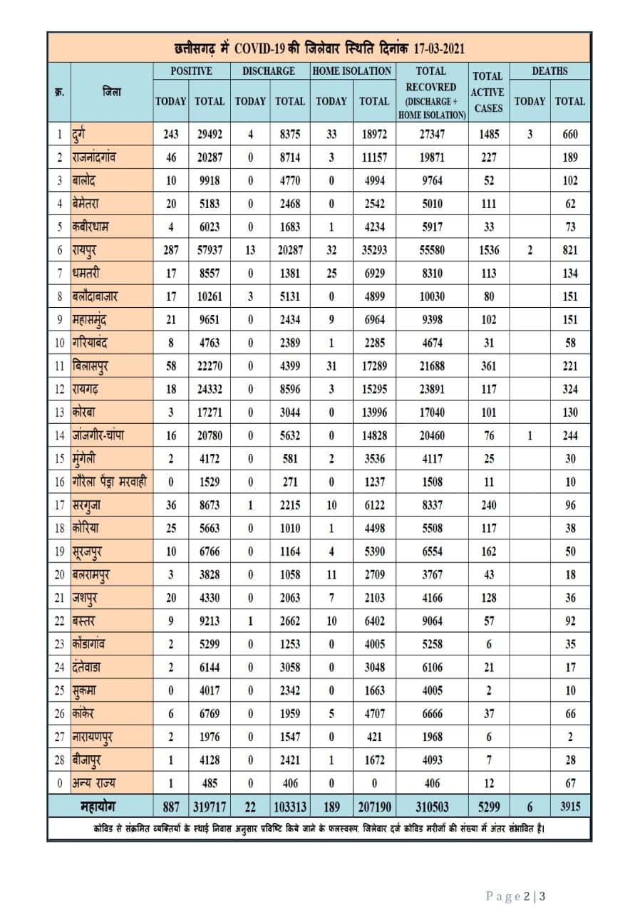रायपुर 17 मार्च 2021। छत्तीसगढ़ में कोरोना की तेज रफ्तार जारी है। प्रदेश में आज कल से भी ज्यादा मरीज मिले हैं। प्रदेश में आज 887 नये मरीज मिले हैं, वहीं सिर्फ 211 मरीज ही कोरोना से स्वस्थ्य हुए हैं। प्रदेश में अब कुल मरीजों की संख्या जहां 3.19लाख से ज्यादा हो गयी है, वहीं 6 लोगों की आज कोरोना से हुई है।