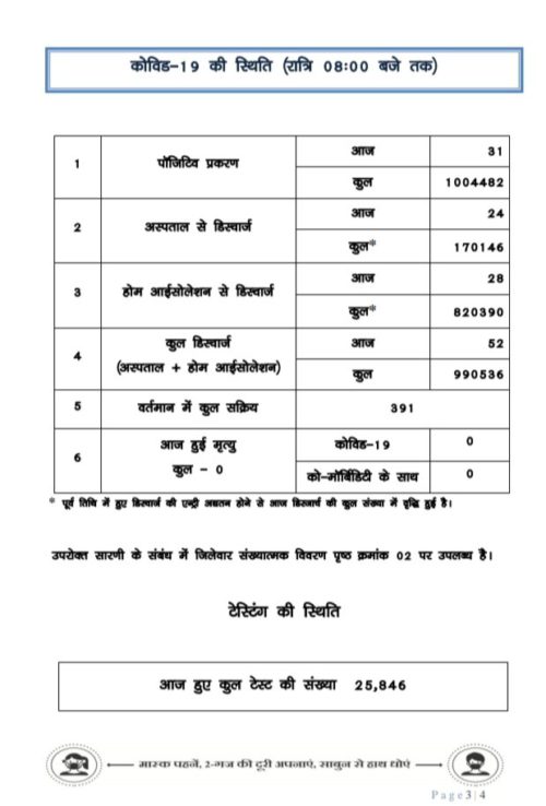 रायपुर 1 सितम्बर 2021. प्रदेश में आज कोरोना के 31 नए मरीज मिले है. वहीँ कोरोना संक्रमण से एक भी मौत नहीं हुई है. साथ बिलासपुर में 5 मरीज, सुकमा में 8 नए मरीज मिले है. देखें जिलेवार आकड़े