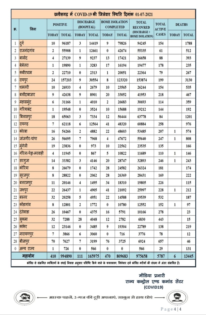 रायपुर 1 जुलाई 2021। छत्तीसगढ़ में आज 410 नये कोरोना मरीज मिले हैं। वहीं 581 कोरोना मरीज स्वस्थ्य भी हुए है। पिछले 24 घंटे में प्रदेश में 6 लोगों की मौत हुई है। छत्तीसगढ़ में अब कुल एक्टिव केस घटकर 5787 रह गए हैं।