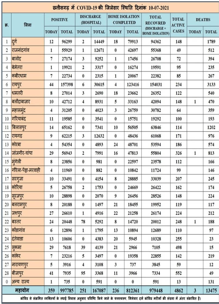रायपुर 10 जुलाई 2021। छत्तीसगढ़ में कोरोना के आंकड़े फिर से बढ़ने लगे हैं। प्रदेश में आज कुल 359 नये मरीज मिले हैं। वहीं 24 घंटे में 3 लोगों की मौत भी हुई है। प्रदेश में आज कुल 487 मरीज स्वस्थ्य हुए हैं। अच्छी बात ये है कि अब कुल एक्टिव मरीजों की संख्या 4862 रह गयी है।