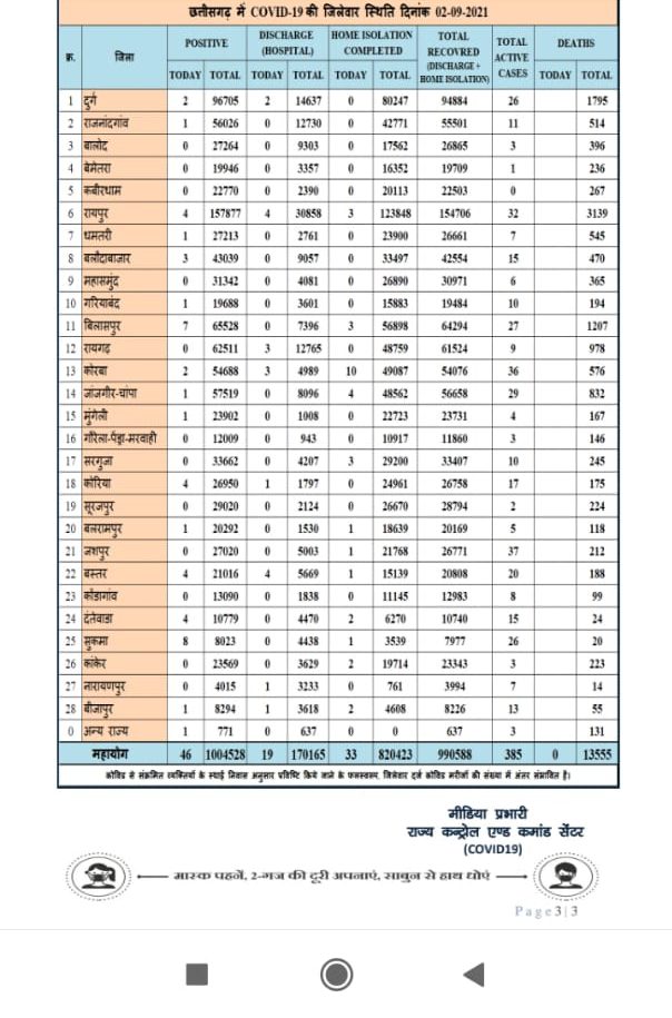रायपुर 2 सितंबर 2021। छत्तीसगढ़ में एक सप्ताह तक कोरोना के आंकडों में गिरावट के बाद फिर से मरीज बढ़ गये हैं। प्रदेश में आज 46 कोरोना के नये मरीज मिले हैं। नये मरीज की तुलना में आज कुल 52 मरीज स्वस्थ्य हुए हैं। प्रदेश में अभी कुल एक्टिव केस 385 है, जबकि राहत की बात ये है कि मौत आज भी एक भी नहीं हुई है।