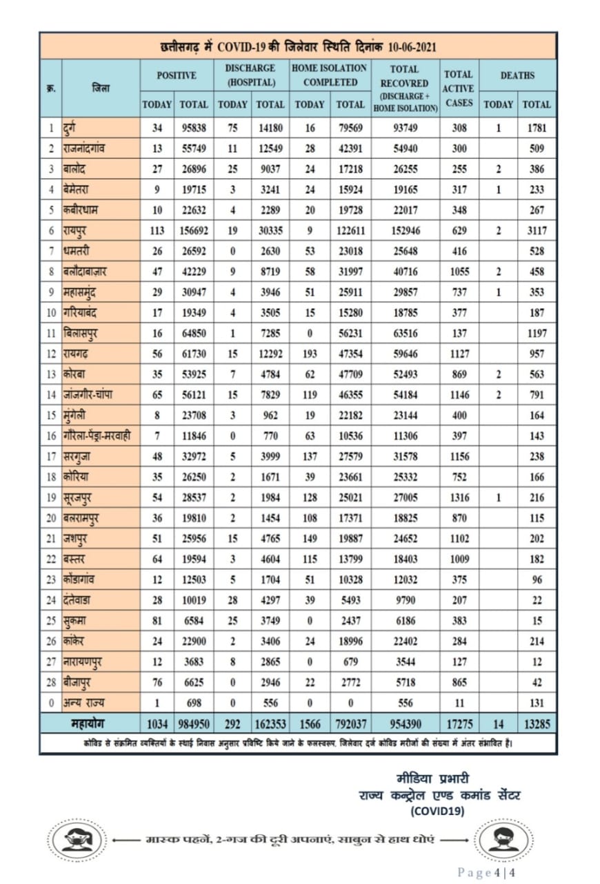 रायपुर 10 जून 2021। छत्तीसगढ़ में आज कोरोना के मरीज फिर 1000 से ज्यादा हो गये हैं। पिछले 24 घंटे में प्रदेश में 1034 नये केस मिले हैं। वहीं 14 लोगों की मौत हुई है। आज प्रदेश में कुल 1858 मरीज कोरोना से स्वस्थ्य हुए हैं।