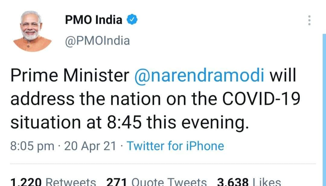 नईदिल्ली 20 अप्रैल 2021. कोरोना संकट के बीच प्रधानमंत्री नरेंद्र मोदी एक बार फिर देश को संबोधित करेंगे. प्रधानमंत्री कार्यालय (PMO) की तरफ से दी गई जानकारी के मुताबिक प्रधानमंत्री आज रात 8:45 पर राष्ट्र के नाम संबोधन देंगे.