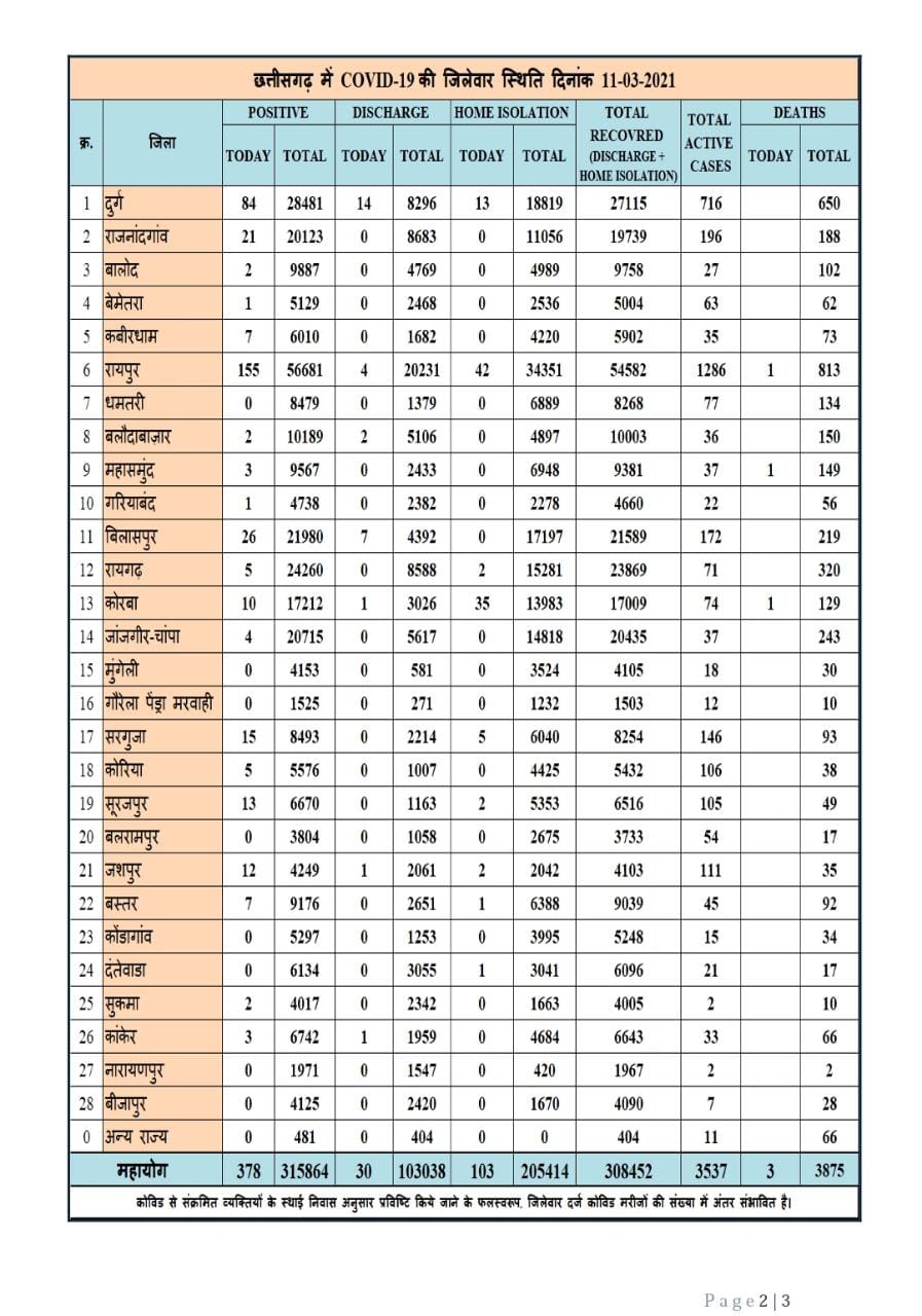 रायपुर 11 मार्च 2021। छत्तीसगढ़ में कोरोना की रफ्तार बरकरार है। प्रदेश में आज 378 नये केस मिले हैं। वहीं सिर्फ 133 मरीज ही कोरोना से स्वस्थ्य हुए हैं। 3 लोगों की कोरोना से मौत हुई है। प्रदेश में अब कुल मरीजों की संख्या बढ़कर 315864 हो गयी है।