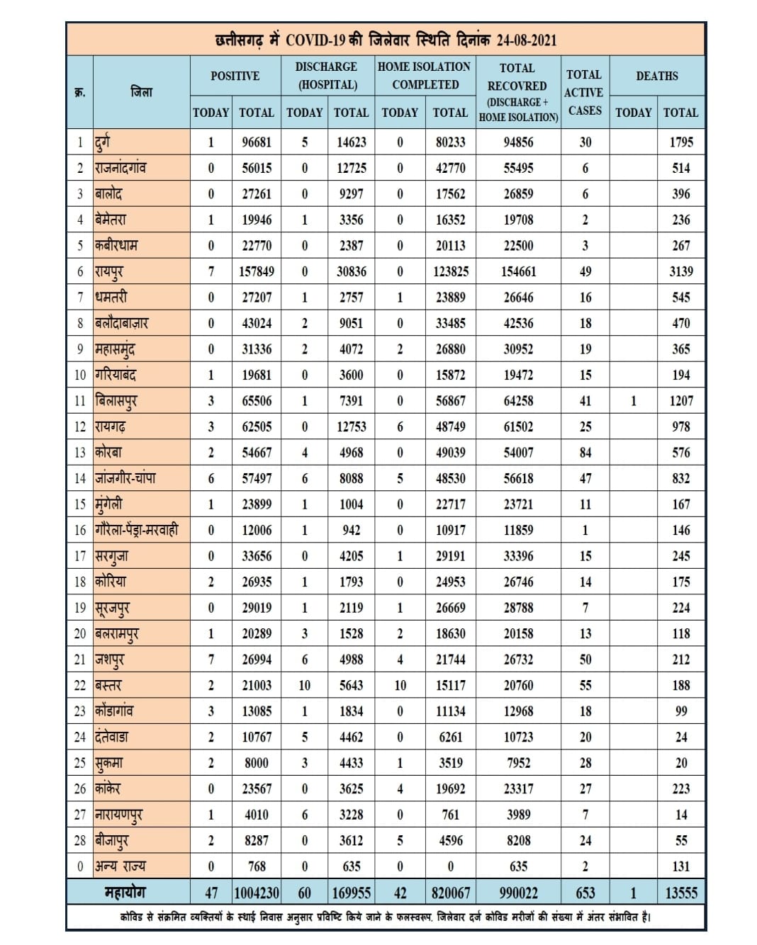 रायपुर और जशपुर में आज सबसे ज्यादा 7 मरीज मिले हैं, वहीं जांजगीर में 6 मरीज मिले हैं। बिलासपुर में आज 3 मरीज मिले हैं, जबकि एक मौत हुई है। 10 जिलों में आज एक भी मौत नहीं हुई है।