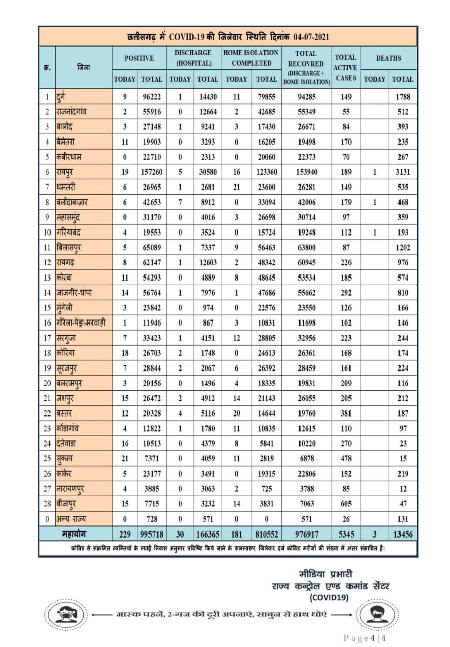 रायपुर 4 जुलाई 2021। छत्तीसगढ़ में कोरोना के मरीज अब 250 से भी नीचे आ गये हैं। प्रदेश में आज कुल 229 मरीज मिले हैं, वही 3 संक्रमित की मौत हुई है।