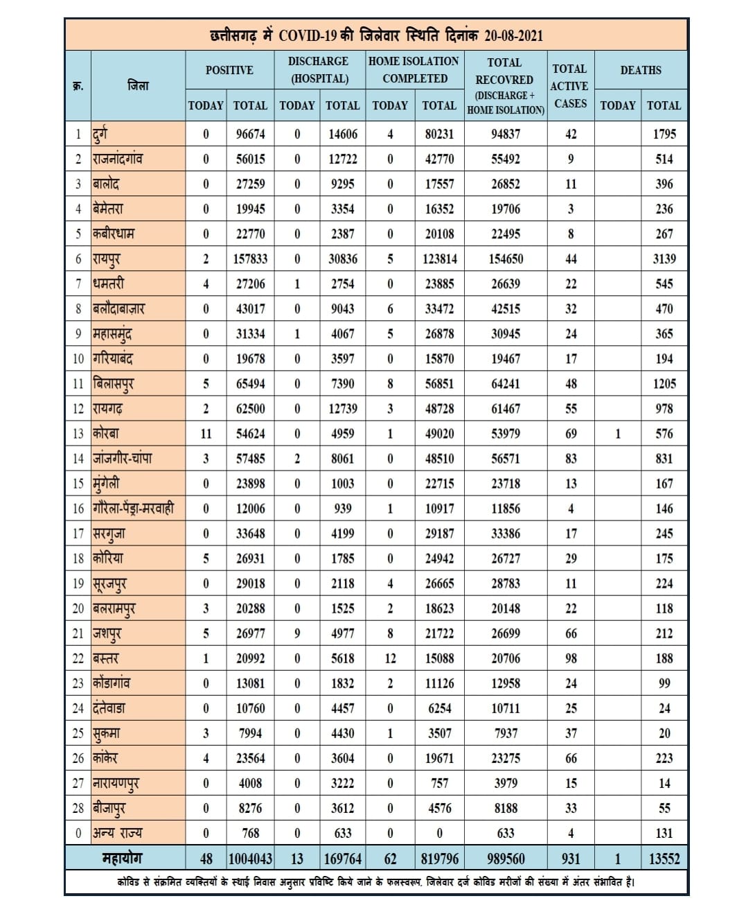 कोरोना ब्रेकिंग : बिलासपुर संभाग के इस जिले में आज सबसे ज्यादा मरीज…. 16 जिलों में आज एक भी नहीं मिले केस… देखिये प्रदेश का हाल
