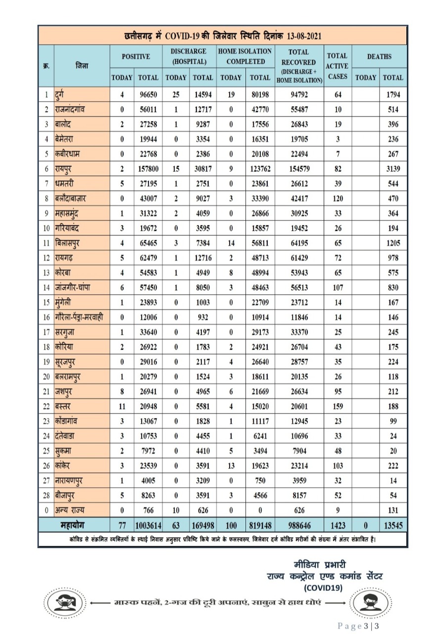 रायपुर 13 अगस्त 2021। छत्तीसगढ़ में लगातार दूसरे दिन एक भी मरीज की मौत नहीं हुई है। प्रदेश में आज मरीज कल की तुलना में काफी कम मिले हैं। प्रदेश में आज सिर्फ 77 नये केस आये हैं, वहीं 163 मरीज कोरोना से स्वस्थ्य हुए हैं।