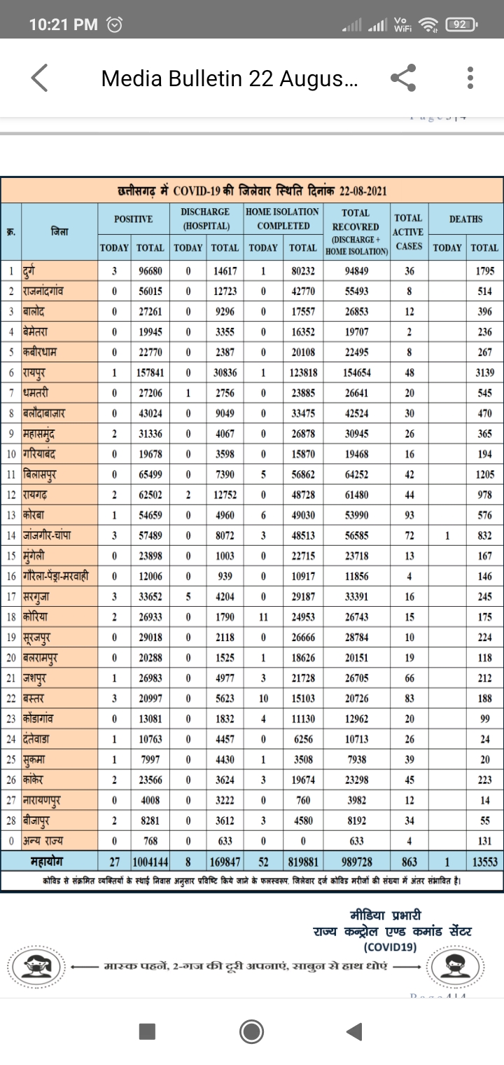 रायपुर 23 अगस्त 2021. प्रदेश में आज 27 नये मरीज मिले हैं. अच्छी बात ये है कि प्रदेश के 14 जिलों में आज एक भी मरीज नहीं मिले हैं. आज राजधानी रायपुर सिर्फ 1 मरीज मिले हैं, जबकि सरगुजा और दुर्ग में 1-1 मरीज मिले हैं.