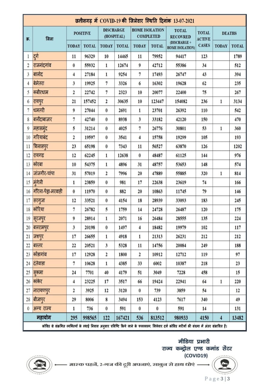 कोरोना ब्रेकिंग : रायपुर-बिलासपुर सहित इन इलाकों में मरीज बढ़े…. मौत का आंकड़ा भी आज बढ़ा… देखिये प्रदेश का हाल