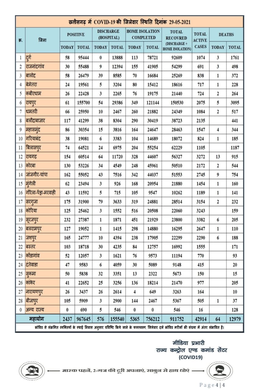 रायपुर 29 मई 2021। छत्तीसगढ़ में कोरोना मरीजों की संख्या तो कंट्रोल में आती दिख रही है, लेकिन मरीजों के मौत के आंकड़े घट नहीं रहे हैं। आज भी कोरोना से प्रदेश में 64 लोगों की जान गयी है। वहीं 24 घंटे में 2437 नये मरीज मिले हैं। प्रदेश में आज कुल टेस्ट 62358 हुए हैं, वहीं आज 5941 मरीज डिस्चार्ज हुए हैं।