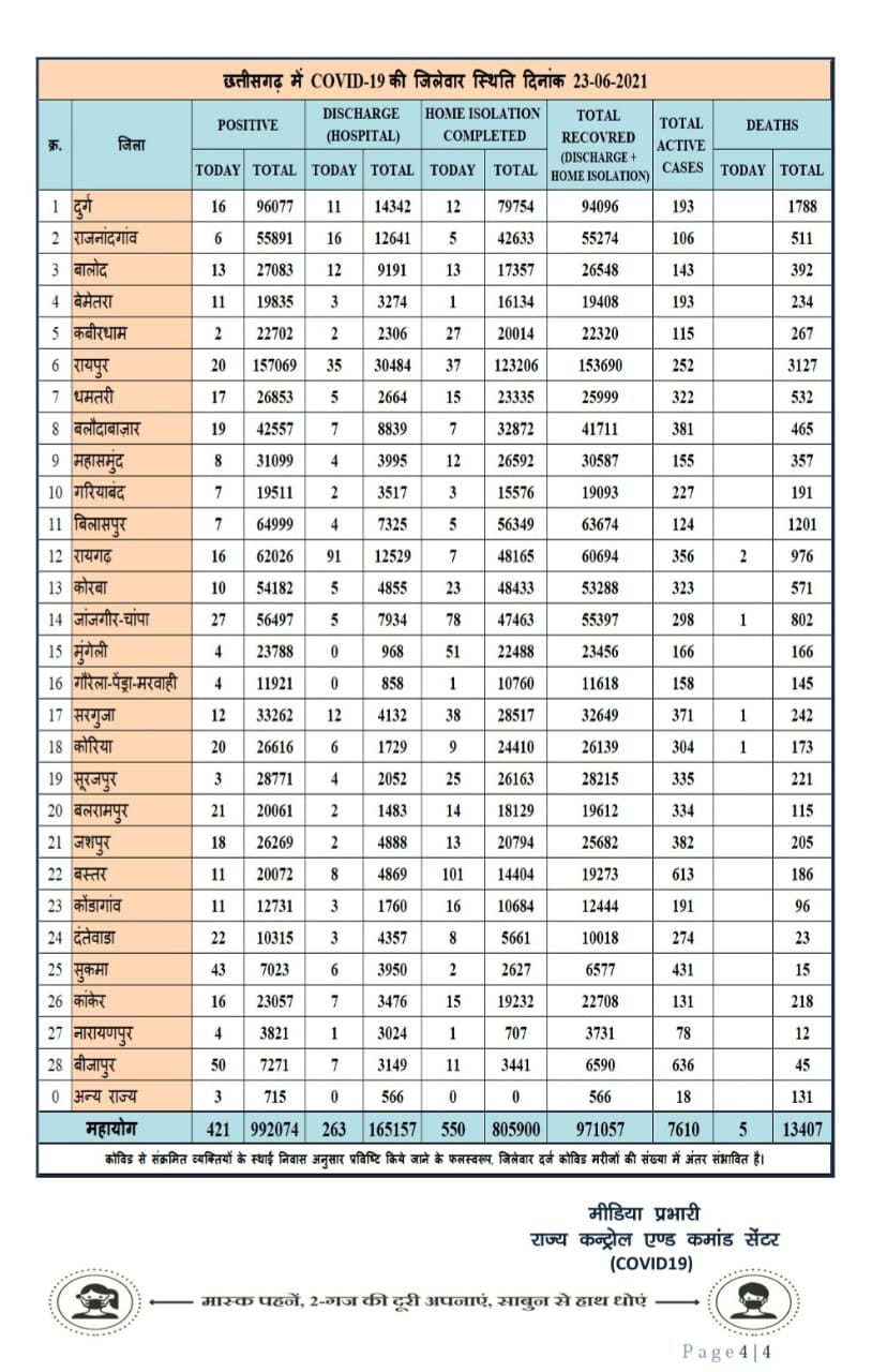 पूरे छत्तीसगढ़ की बात करें तो आज कुल 421 मरीज मिले हैं. वहीं पिछले 24 घंटे में 5 मरीजों की मौत हुई है। आज कुल 813 मरीज स्वस्थ्य भी हुए हैं। कुल एक्टिव केस की बात करें तो प्रदेश में अभी कुल एक्टिव केस 7610 हैं।