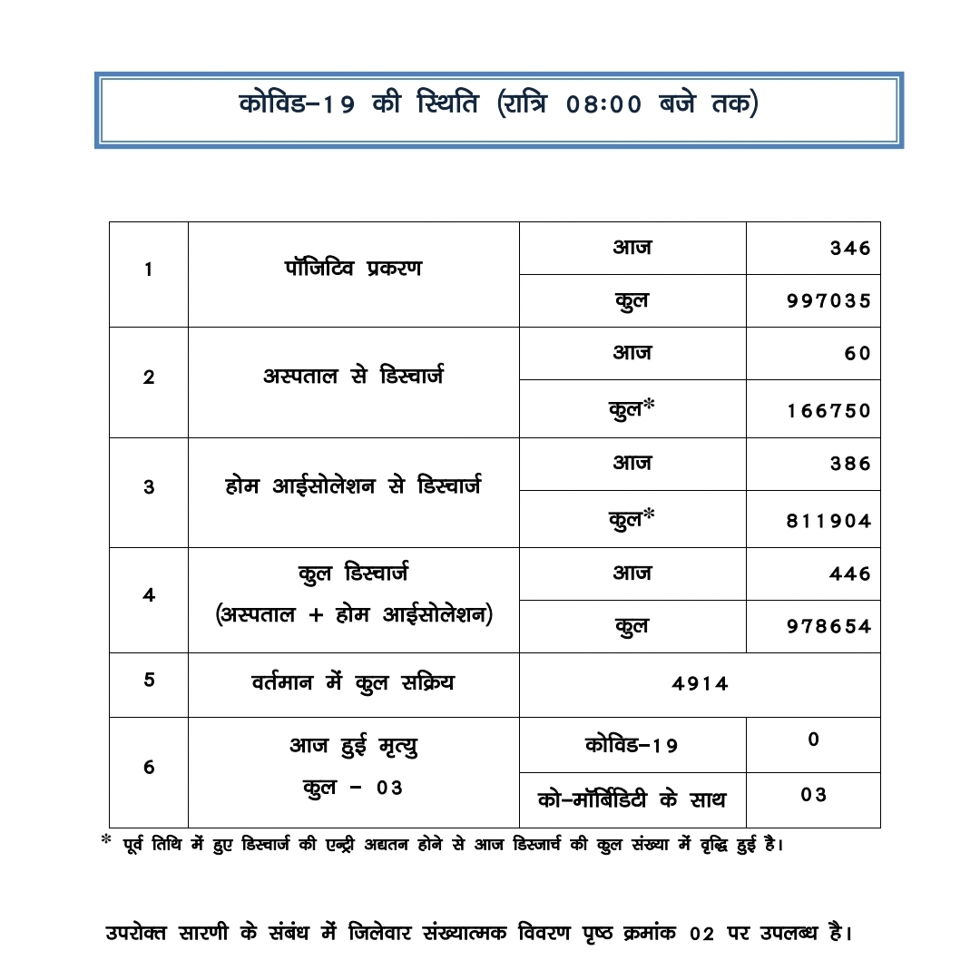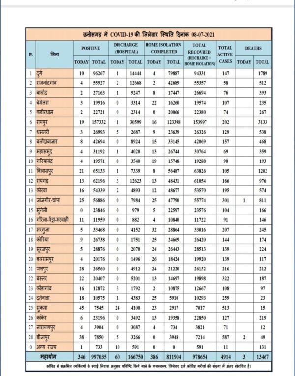 रायपुर 8 जुलाई 2021। प्रदेश में आज कोरोना के 346 नये मरीज मिले है। वहीं टोटल मरीजों की सख्या अब प्रदेश में 9,970,35 हो गयी है। वहीं आज कोरोना से तीन लोगों की मौत हुई है। देखें कोरोना मरीजो के जिले वार आकड़े…